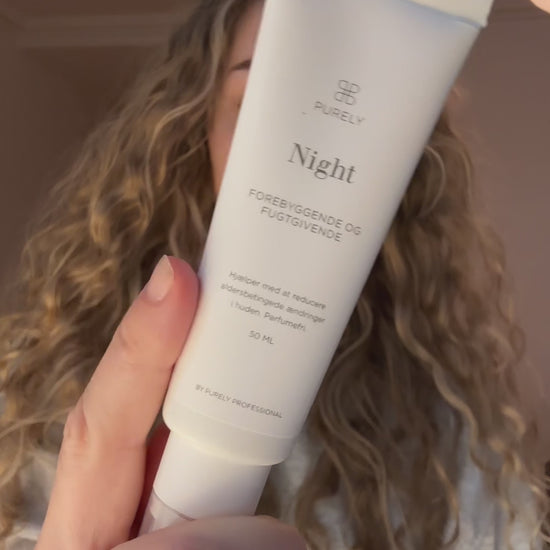 Night: Afslut med Night som er en nærende creme med både hybenkerneolie, niacinamide og det aktive algeekstrakt fucoidan, som modvirker aldersrelateret nedbrydning af huden. Night sikrer at du vågner op med velplejet og blød hud.