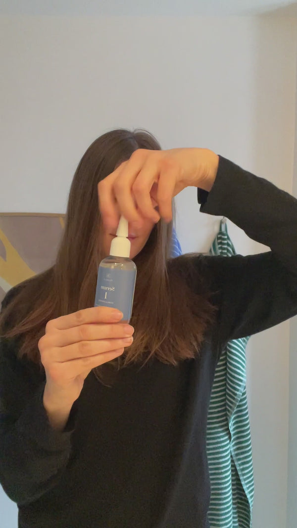 Serum 1: Effektivt hovedbundsserum til alle hårtyper, der booster sund hårvækst og øger fylden fra hårrødderne. Det bioteknologiske gurkemeje-ekstrakt stimulerer hårfolliklerne, mens niacinamide plejer hovedbunden, så håret får de bedste betingelser for sund vækst.