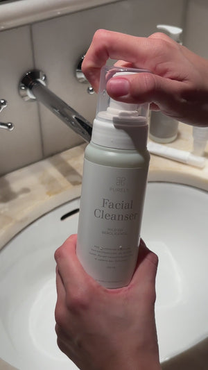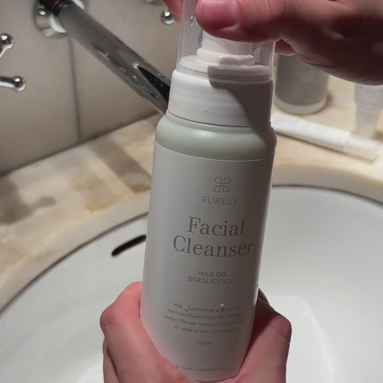 Facial Cleanser: Beroligende skumrens der balancerer alle hudtyper. Det sulfatfrie skum renser huden blidt med indhold af kamille, der forbedrer og plejer beskadiget hud, samt glycerin, der blødgør og fugter huden.