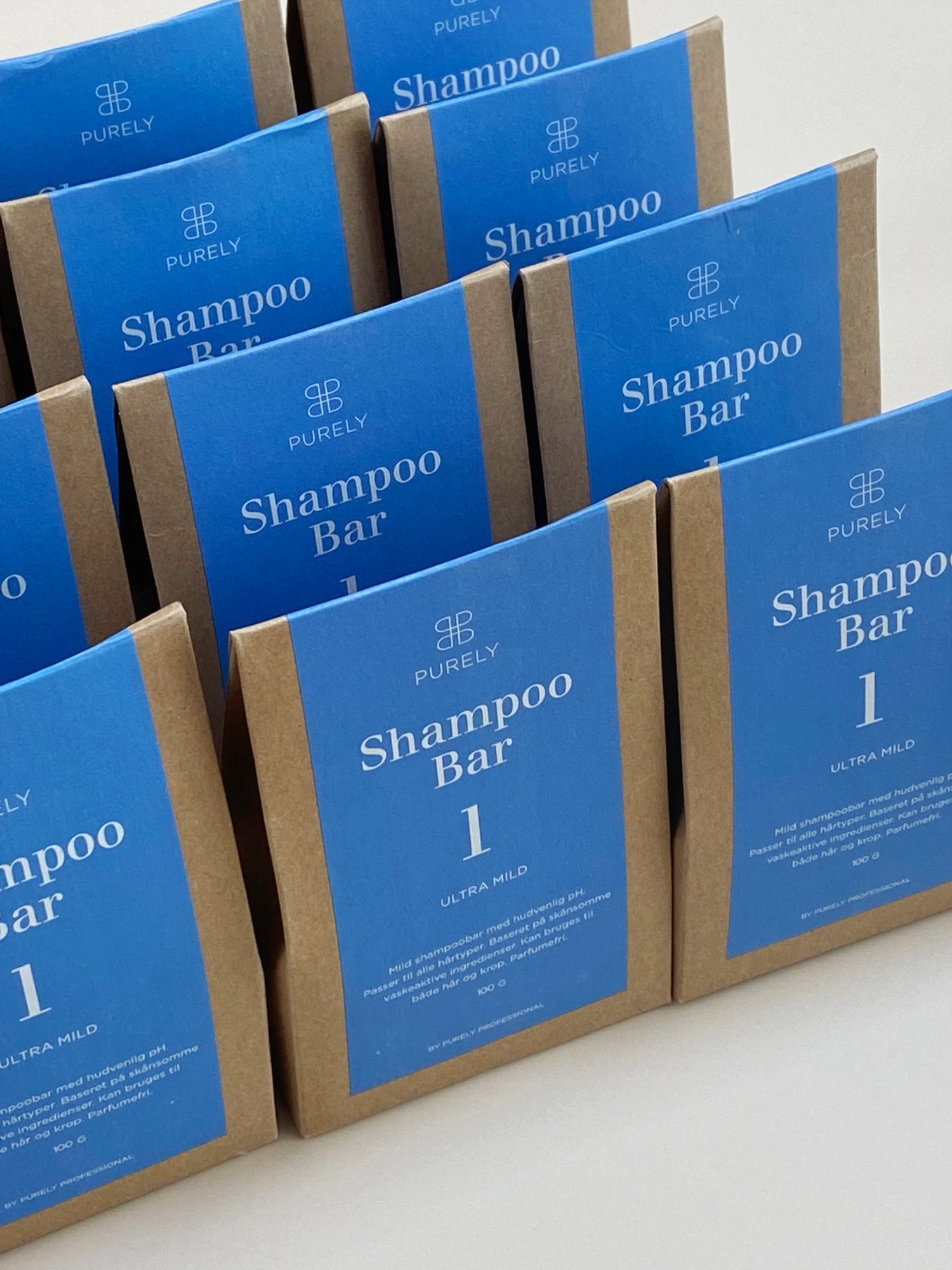 Vi har også introduceret Purely produkter, der er helt plastikfri. Purely Shampoo Bar 1 og 2 er faste produkter pakket i beholdere af genanvendt pap. Med en shampoobar sparer du både på emballagen og også på den mængde, der transporteres rundt. En shampoobar på 70-100 g er meget koncentreret og svarer til ca. 3-500 g af det tilsvarende flydende produkt.